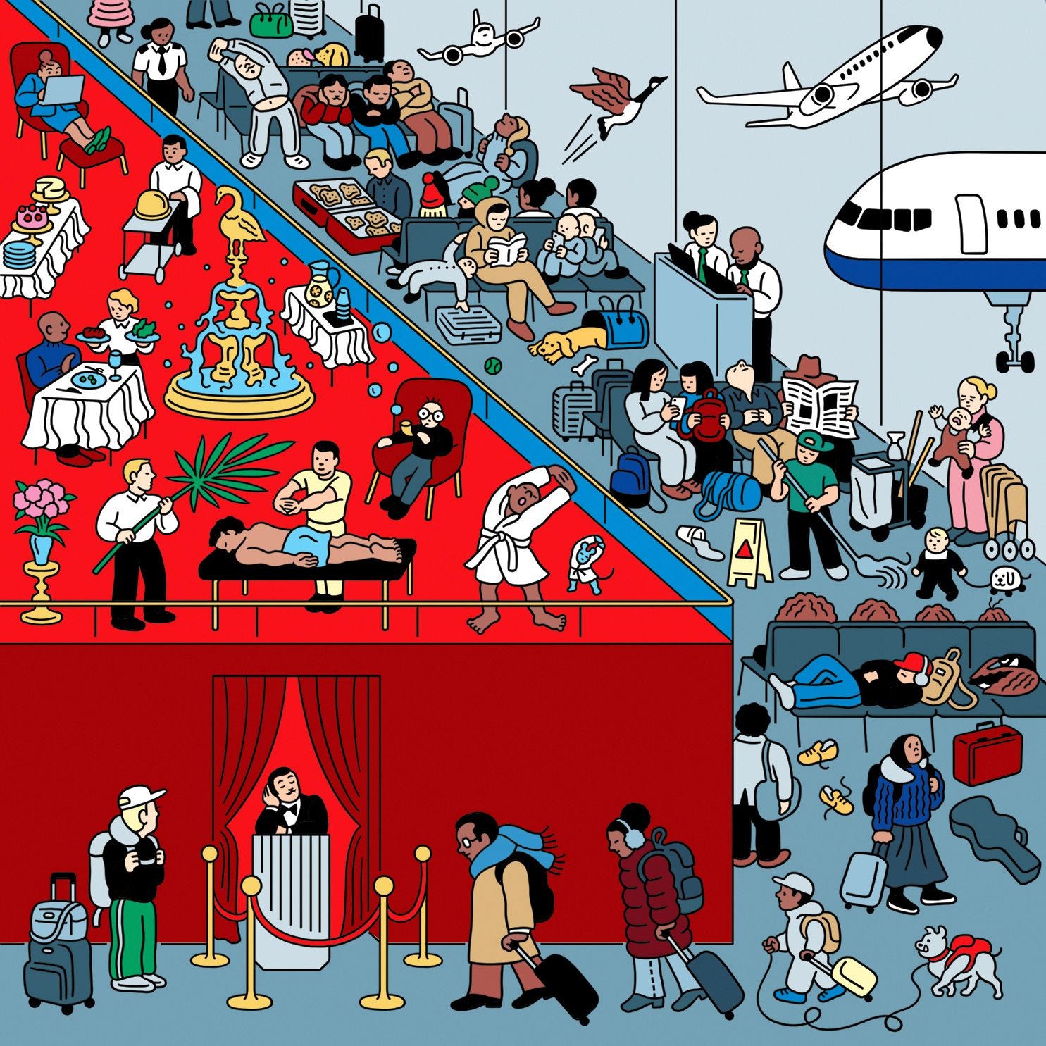 Le lounge aeroportuali sono una questione di chi entra e chi no. Ci sono lounge con hot dog sui rulli, lounge con pedicure e lounge con maggiordomi personali. La facilità di accesso varia di conseguenza. La maggior parte delle persone in aeroporto non visita mai una lounge. Se lo facesse, in un certo senso vanificherebbe lo scopo stesso di questi spazi.